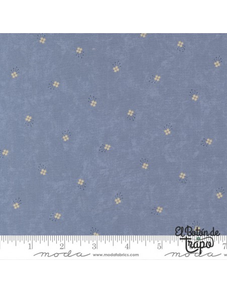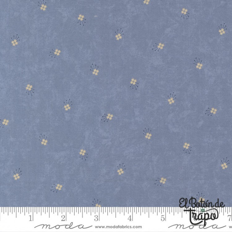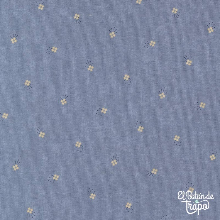 ela en tono azul empolvado con pequeñas flores amarillas, creando un diseño delicado y luminoso. Ideal para quilts, aplicaciones y proyectos de costura creativa con un estilo suave y primaveral.
