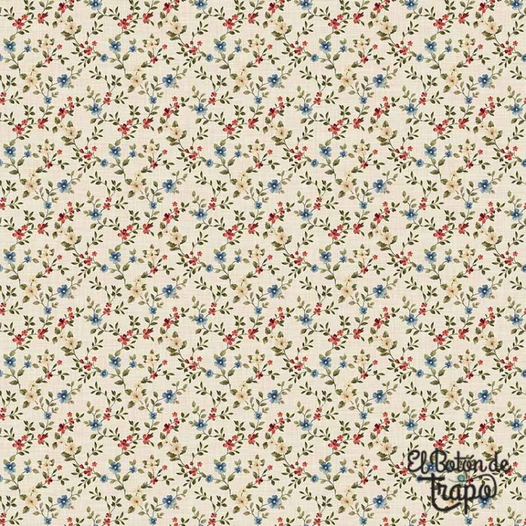 Tela de algodón para patchwork de la colección Farmhouse Sampler de Northcott diseñada por Deborah Edwards. Este estampado muestra delicadas ramas florales en tonos rojo, azul y beige sobre fondo crema con textura efecto lino.