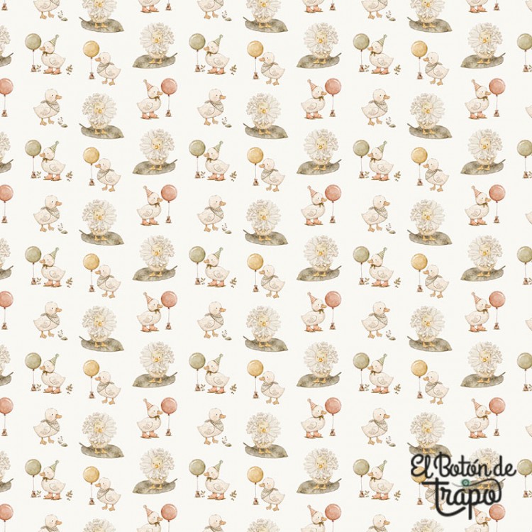 Tela de algodón para patchwork de la colección Tiny Waddles, con un encantador estampado de patitos juguetones en suaves tonos sobre fondo crema. Su estilo dulce y delicado la convierte en una opción perfecta para proyectos infantiles.