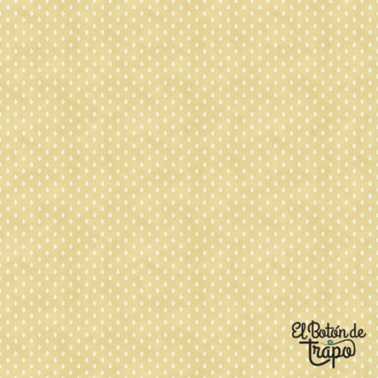 Tela de algodón de la colección Tiny Waddles con delicado estampado de pequeñas hojas sobre fondo dorado suave. Su diseño sencillo aporta textura y combina perfectamente con el resto de estampados de la colección.