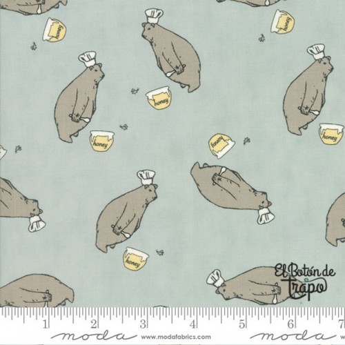 Tela para Patchwork de color agua, estampada con unos tiernos ositos grises y tarros de miel.
